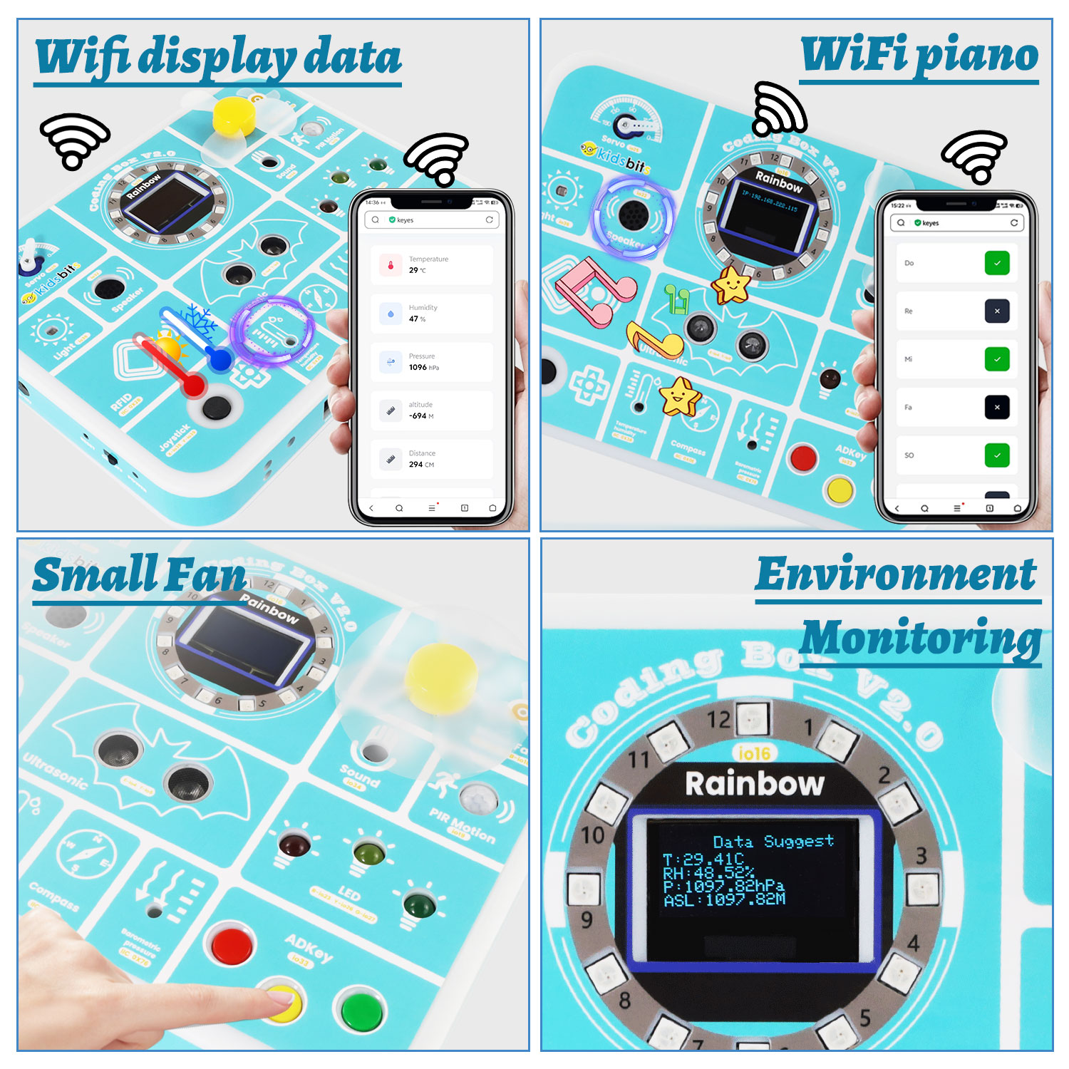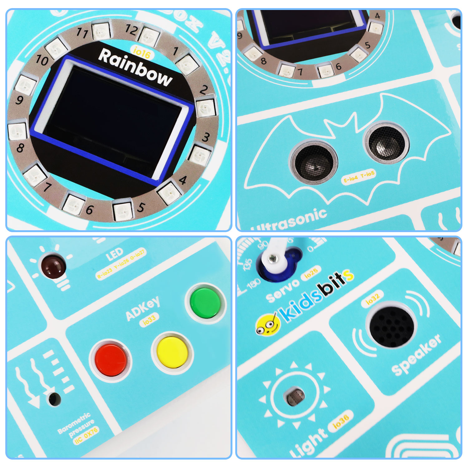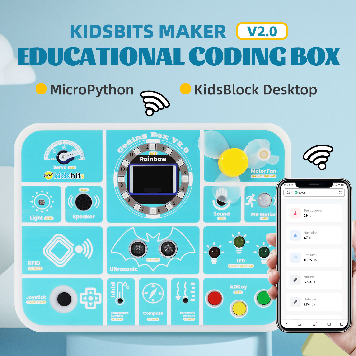 kidsbits 多功能编程盒 V2.0 以 ESP32 开发板为控制核心,集成 16 个传感器与模块,采用全封闭外壳设计,无需担心接线错误烧毁模块。支持图形化编程和 MicroPython 编程,预留 4 个 RJ11 扩展接口,兼容 IIC 通信协议,是儿童 STEM 编程启蒙的理想工具。内置 Wi-Fi 和蓝牙,可实现物联网项目开发。